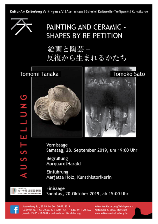 Unter dem Titel „Painting and Ceramic - shapes by repetition“ zeigen die Keramikerin Tomomi Tanaka und die Malerin Tomoko Sato ihre Werke in den Galerieräumen von Kultur Am Kelterberg Vaihingen e.V. Die Ausstellung wird am Samstag, den 28. September um 19:00 Uhr eröffnet und dauert bis zum Sonntag, den 20. Oktober 2019. Die Öffnungszeiten sind jeweils samstags und sonntags von 15:00 bis 18:00 Uhr.