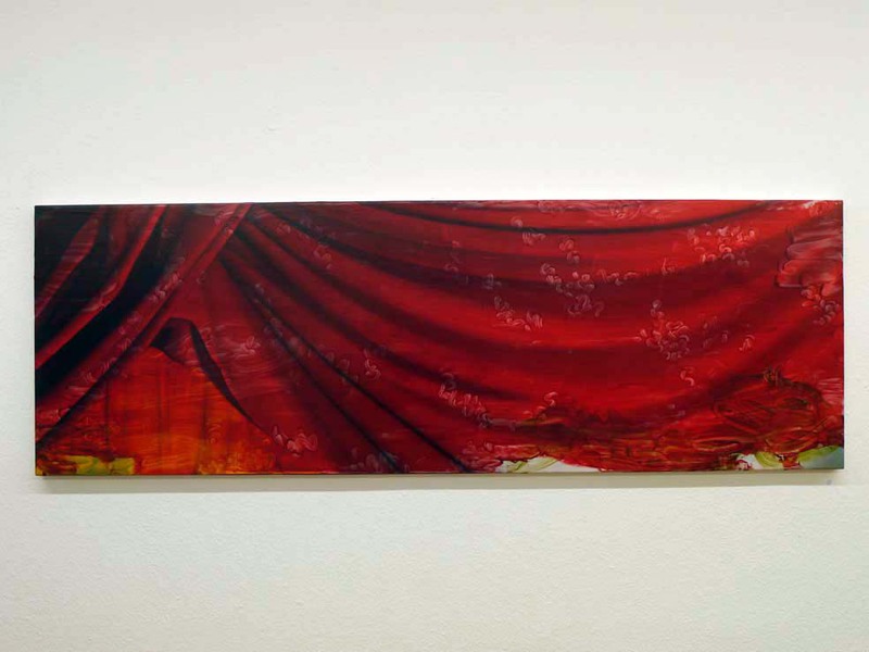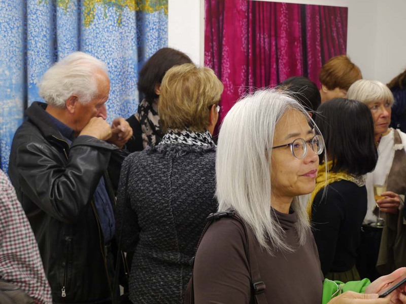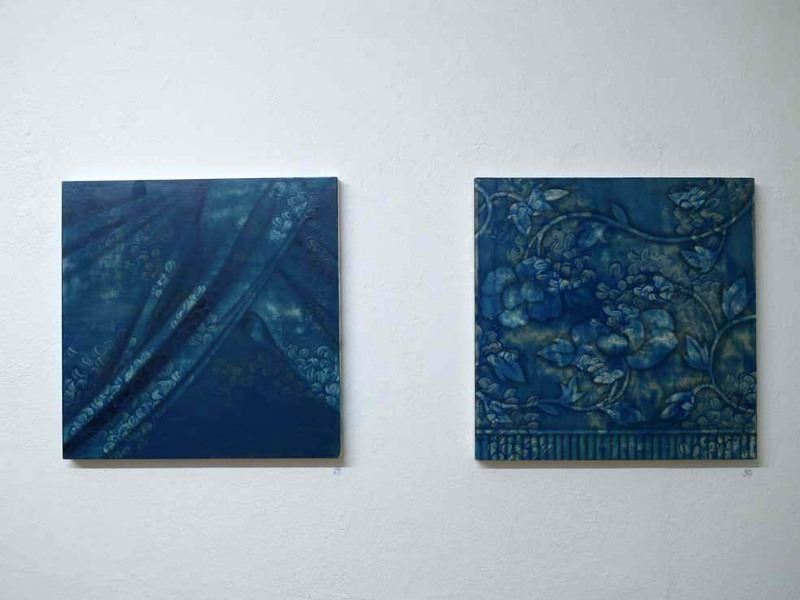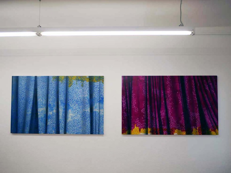 Viele kleine Einzelformen, die in variierenden Wiederholungen eine einheitliche Gestalt ergeben, finden sich auch im Werk der Malerin Tomoko Sato wieder. Diese Gemeinsamkeit hat die Künstlerinnen dazu veranlasst, zusammen auszustellen – daher auch der Titel „shapes by repetition“. Tomoko Sato, die seit 2016 in Köln lebt und neben ihrer eigenen künstlerischen Tätigkeit auch Ausstellungen und Kunstprojekte organisiert, arbeitet in klassischer europäischer Ölmalerei. Ihr Thema sind Stofffalten, die sich in unendlichen Variationen aneinanderreihen. Durch das Übereinanderlegen mehrerer Schichten von Ölfarbe erreicht sie in ihren Bildern eine faszinierende plastisch-räumliche Wirkung.