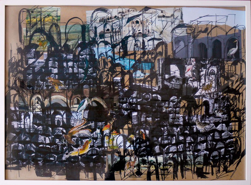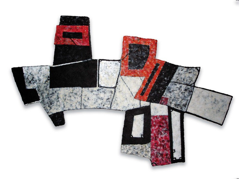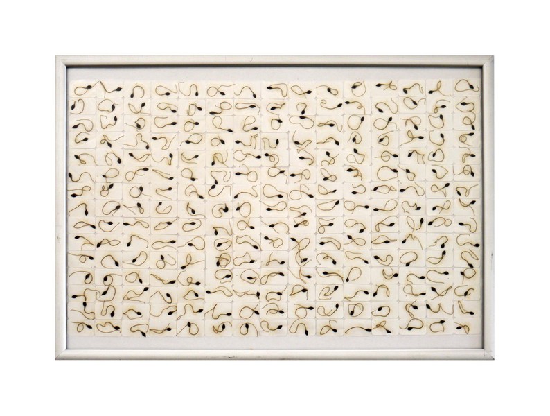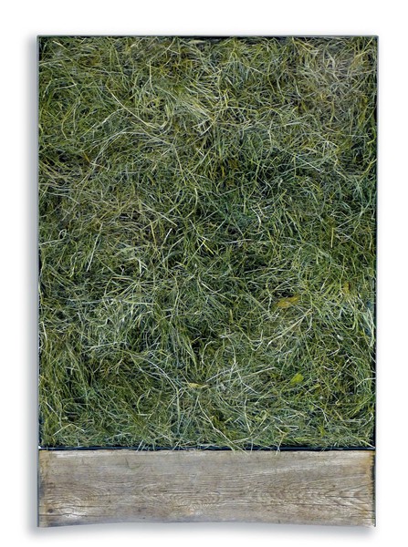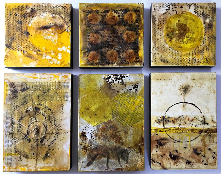 Die Sorge um das geheimnisvolle Artensterben mag ein Leitgedanke der sechsteiligen Arbeit von Ute Haselmaier sein, die mit duftendem Wachs, Honig, Blütenbestandteilen sowie der leitmotivisch wiederkehrenden Struktur der Bienenwaben ihre Collagen auf je drei quadratischen und drei hoch-rechteckigen »Bildern« gestaltet. Übergreifend ist als Leitfarbe ein leuchtendes Gelb verwendet, was im Kontrast zu Braun-Schwarz und Weiß einen warnenden Charakter annimmt. Aus dem Untergrund scheinen endlose Reihen von geheimnisvollen Zahl-Buchstaben-Kombinationen auf. Vielleicht eine Andeutung der bewunderten, weil als vollkommen geltenden Organisation der Welt eines Bienenvolks, die eine Ahnung von der Schönheit und Vollkommenheit des Paradieses geben könnte. Ein Hauch der Trauer über den befürchteten Verlust liegt über den sechs Täfelchen, die den Bienen, und damit einem wichtigen Bestandteil der Schöpfung, ein Denkmal setzen.