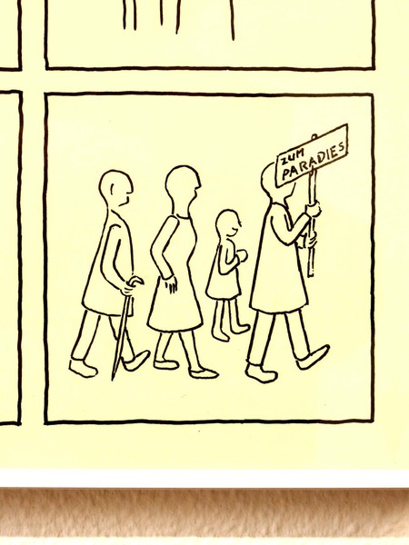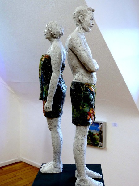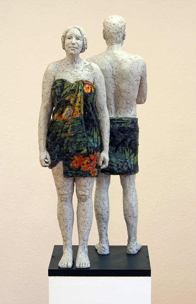 Jenseits dieser Ursituation haben Mann und Frau heute einander den Rücken zugewandt. Das Feigenblatt der abendländischen Kunst als Ausdruck für die demütigende Erkenntnis nackt zu sein, verwandelt die Bildhauerin ironisch in ein Handtuch mit exotischem Blumendekor. Das Menschenpaar hält sich nicht mit Trauer über das Verlorene auf, auch nicht mit der Sehnsucht nach dem Paradies, gönnt sich stattdessen regelmäßig einen Kurzurlaub am Hotel-Pool?