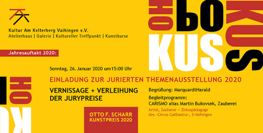 Die diesjährige jurierte Themenausstellung des Vereins Kultur Am Kelterberg Vaihingen e.V. steht unter dem Motto „Hokus Pokus“. Zur Vernissage am 26. Januar um 15:00 Uhr sind alle Interessierten herzlich eingeladen. Der Vereinsvorsitzende MarquardtHarald wird in die Ausstellung einführen, das Begleitprogramm gestaltet passend zum Thema der Vaihinger Zauberkünstler CARISMO. An diesem Nachmittag wird auch der der Otto F. Scharr-Kunstpreis zum 4. Mal vergeben.