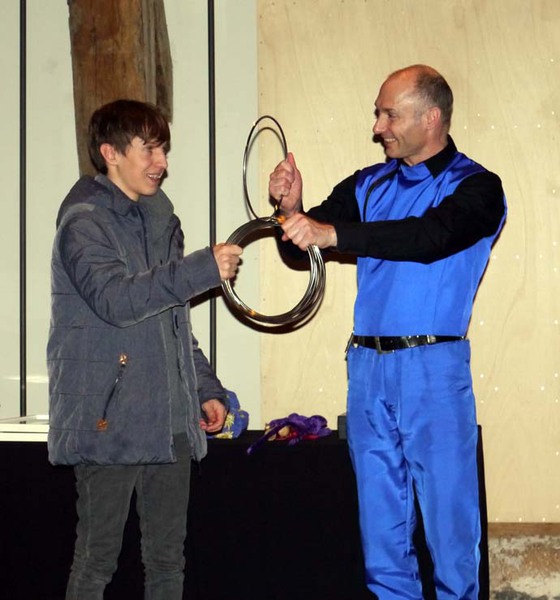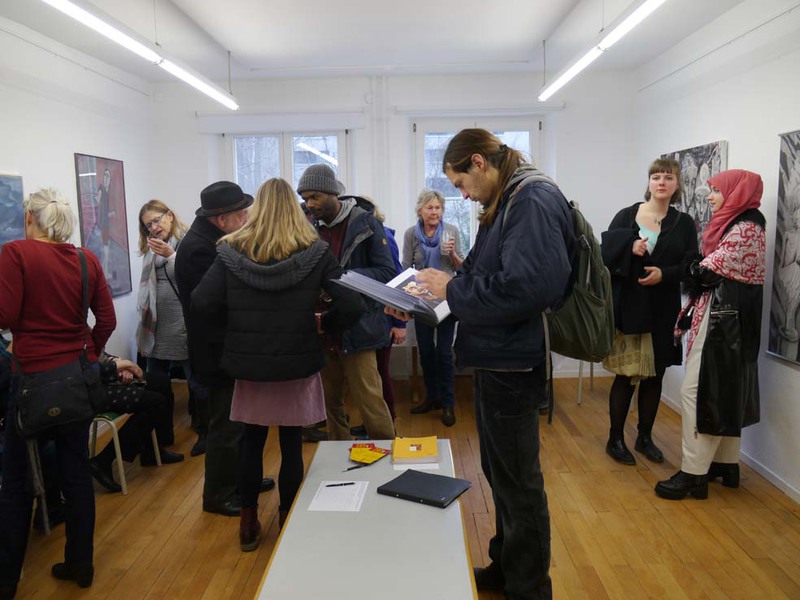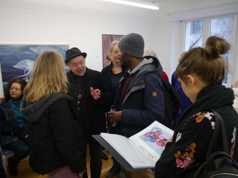 Vernissage-Besucher auf den Zauberkünstler CARISMO.