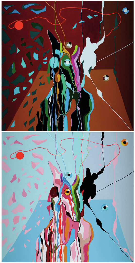 Die Formgebung ist auf beiden Bildern nahezu identisch. Es sind die »zwei Seiten einer Medaille«. Es ist ein Spiel mit den Befindlichkeiten und der eigenen Identitätswahrnehmung, bei dem das Gute und das Böse sehr nahe beieinanderliegt und zu jeder Zeit in die eine oder andere Richtung kippen kann. Das Doppelbild zeigt diese Metamorphose von Licht und Schatten, von lebensfroher Erwartung, die in der Hoffnungslosigkeit enden kann und umgekehrt. Die vielseitig begabte Künstlerin zeigt hier eine Facette ihrer Wandlungsmöglichkeiten und bemerkenswerten Vielfalt ihrer künstlerischen Ausdrucksfähigkeit. Es ist ein Sinnbild