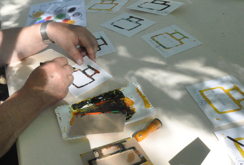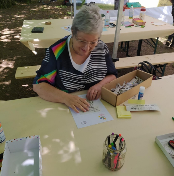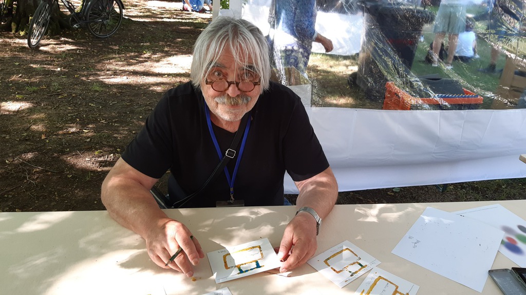 Hunderte von Postkarten wurden mit Acrylfarbe mit diversen „Stempeln“ zu kleinen Kunstwerken gestaltet. Kinder, Jugendliche und viele Erwachsene Besucherinnen und Besucher nahmen das Angebot begeistert auf und waren stolz auf das Ergebnis.