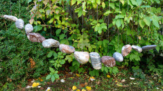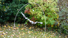 ca. faustgroß) an Nylonfäden, aufgehängt am Baustahl-Bogen