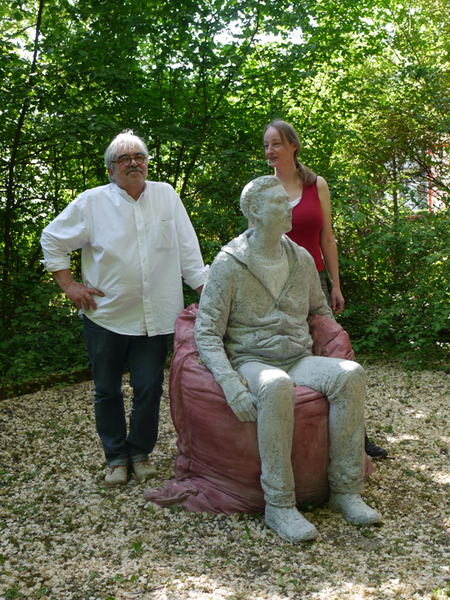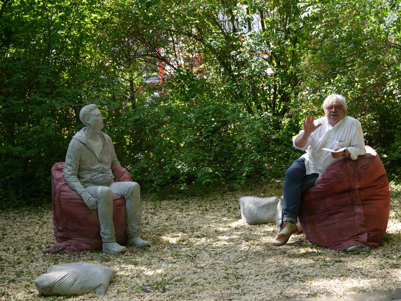 So sind zum Beispiel ihre „Smombies“ entstanden: eine Reihe von Menschen, Grau in Grau, die nicht von ihrem Smartphone aufblicken. Manchmal ist es eine Idee, die den Ausgangspunkt bildet. Für „Besuch bei Marko“ hat sich Birgit Feil etwas für eine Nische im Stadtpark einfallen lassen, wo sie etwas „Bequemes, Intimes“ installieren wollte. Ihr eingereichter Entwurf verwandelt den Platz in ein Wohnzimmer, wo besagter Marko auf einem Sitzsack Hof hält. Auf einem leeren Sitzsack daneben können die Passanten Platz nehmen: sie sind der Besuch bei Marko.