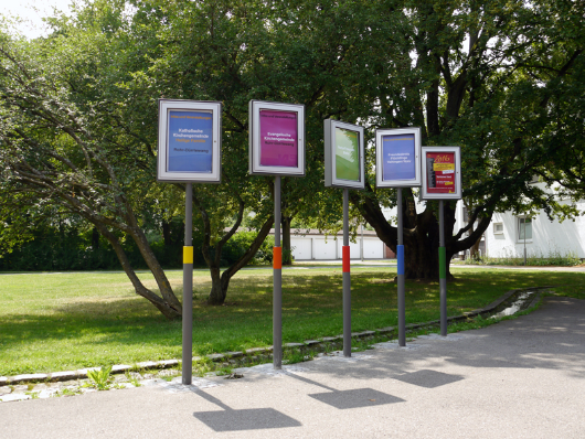 Die in den Aufbau integrierten »Schaukästen« sind einzeln abschließbar und beidseitig nutzbar und haben die Größe eines Din-A3 Plakates. Die Höhe der einzelnen Stelen sind ca. 170-180 cm. Die Stelen sind herausnehmbar, sodass diese bei Veranstaltungen auf dem Vaihinger Markt kurzfristig entfernt werden können.