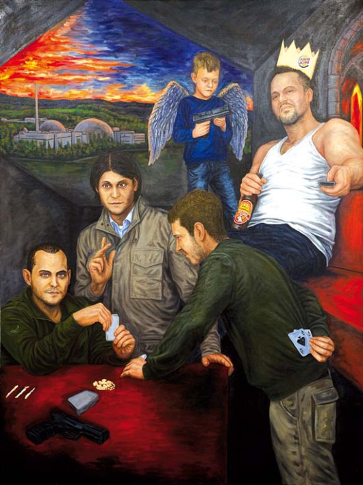Aus diesen Zeichenübungen entwickeln wir dann eine Skizze oder fertige Zeichnung. Diese wird dann auf einen Bildträger übertragen (Leinwand, Papier oder Karton) und mit Ölfarben (schwarz, weiss, grau) untermalt. Anschließend wird in Lasurtechnik schichtenweise übermalt und farbig ausgestaltet.
